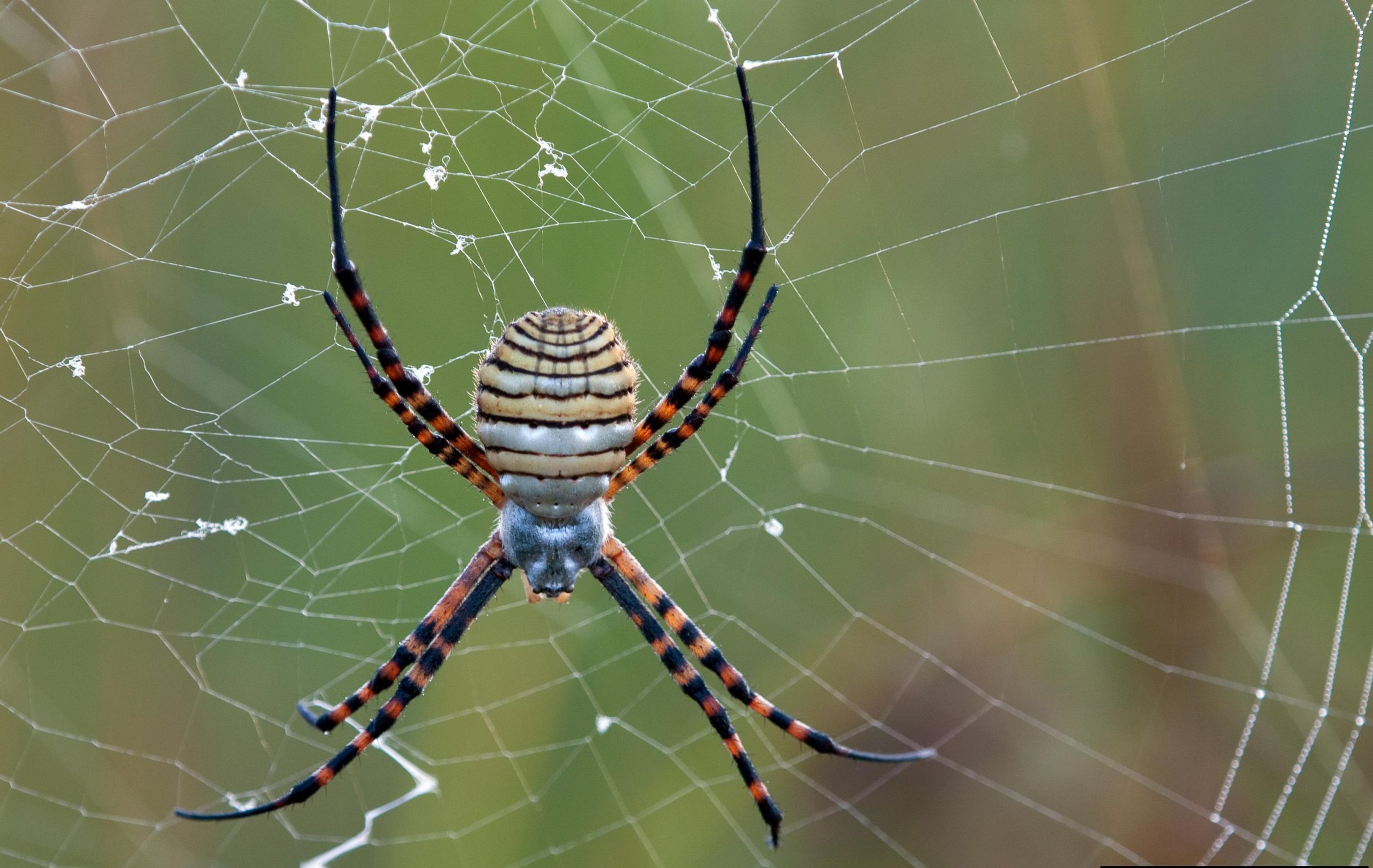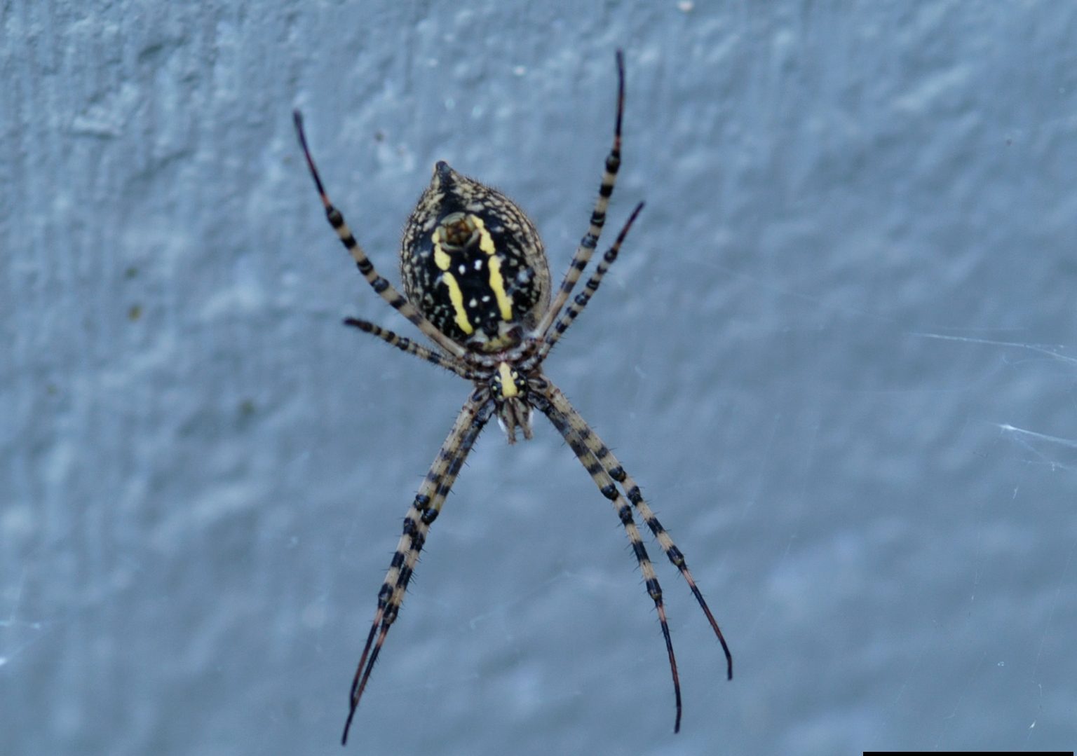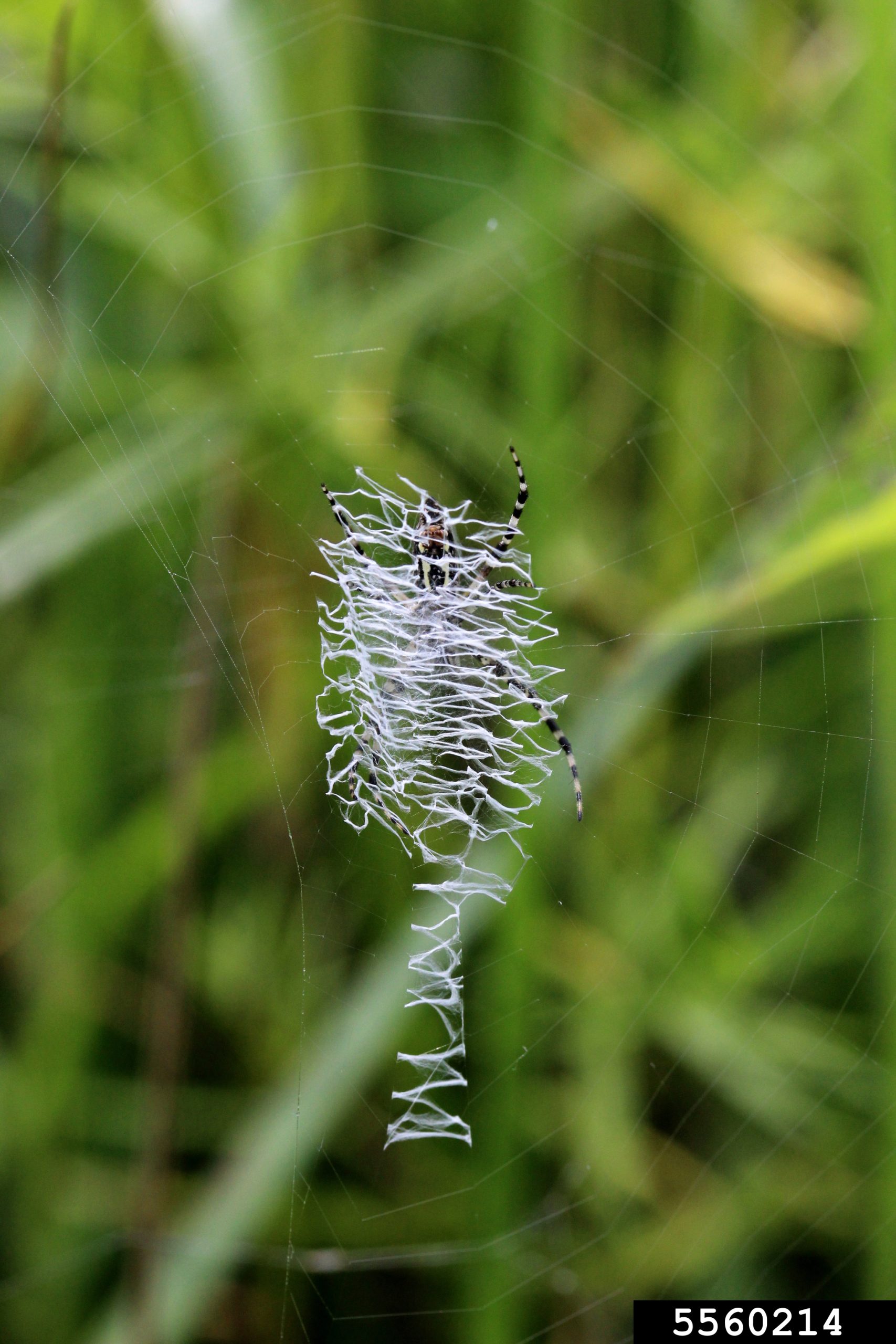 The banded garden spider (Argiope trifasciata) has many thin black, yellow, and silvery white bands on its abdomen.