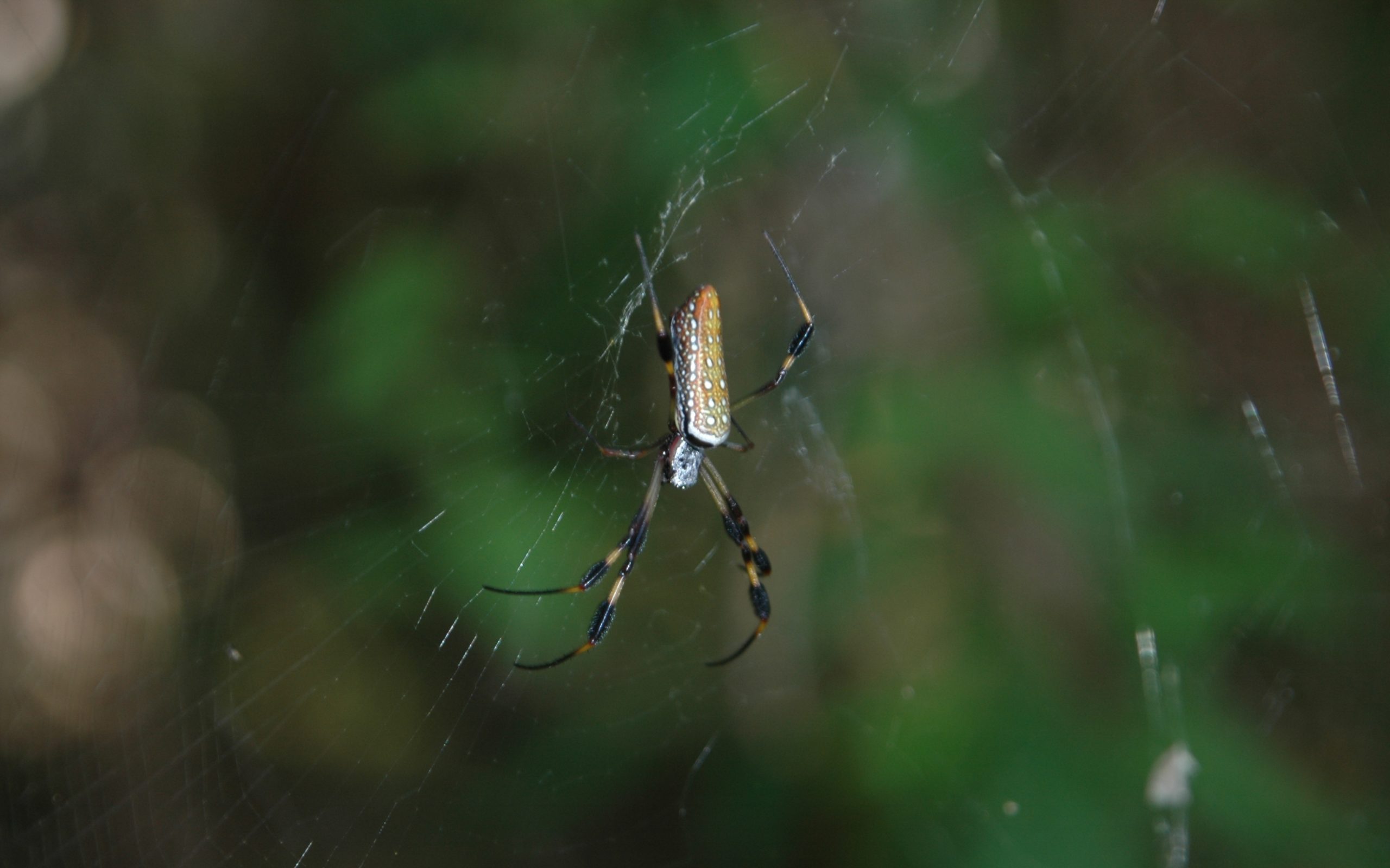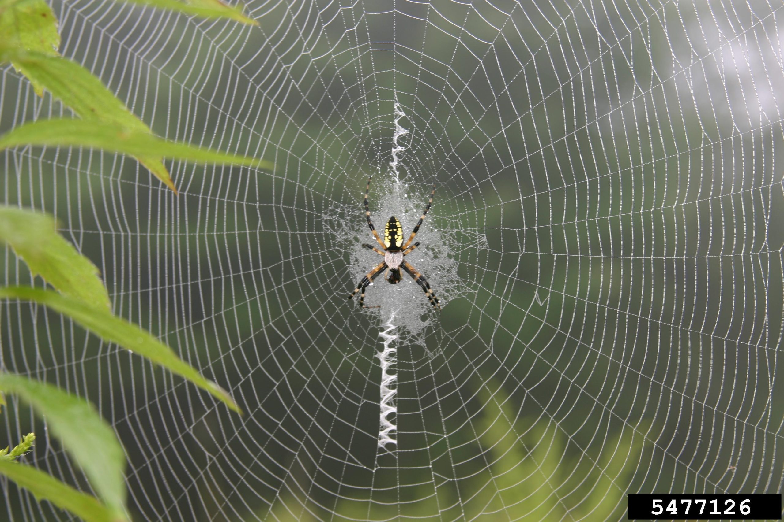 The yellow garden spider (Argiope aurantia) has a distinctive yellow and black abdomen. Its web often has a zig-zag above and below a dense center.